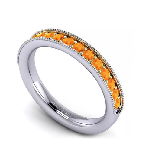 Hlavní roli zde hraje 15 kusů přírodních oranžových safírů o velikosti 2 mm, precizně vsazených do šíny prstenu. Jejich ohnivá barva vyzařuje energii, radost a vášeň, zatímco jejich vzácnost podtrhuje exkluzivní charakter šperku.