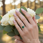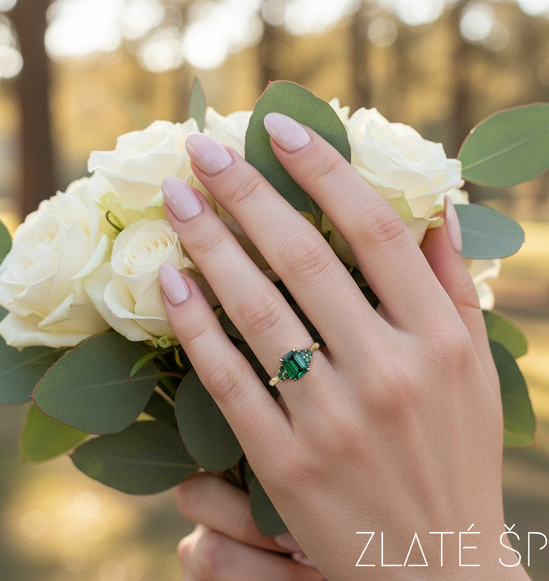 Prsten je dostupný s centrálním smaragdem, který symbolizuje naději a lásku, nebo s kamenem z bílého křišťálu, jenž dodává šperku čistý a nadčasový vzhled. Alternativně lze zvolit i luxusní modrý safír, který svou hlubokou barvou zaujme každého. Prsten je dále zdoben 6 kulatými kameny o velikosti 2 mm, které jemně doplňují centrální drahokam a dodávají šperku jiskru.