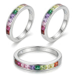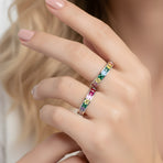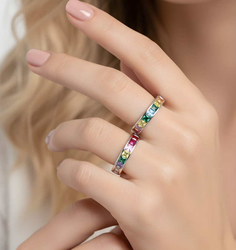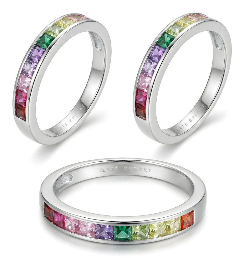 Prsten zdobí 10 barevných safírů o rozměru 3 mm, broušených do precizního princess brusu, který vyniká ostrými liniemi a výrazným leskem. Safíry jsou pečlivě vybrány v různých odstínech a poskládány tak, aby barvy plynule přecházely jedna v druhou, čímž vytvářejí unikátní barevný rytmus a moderní vzhled.
