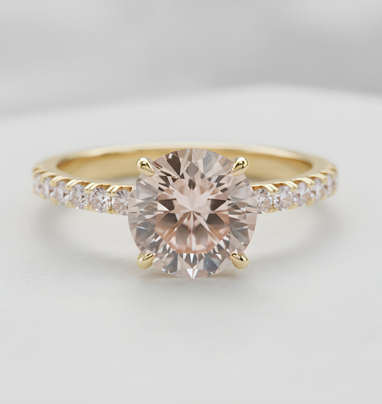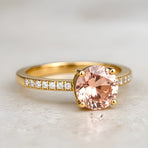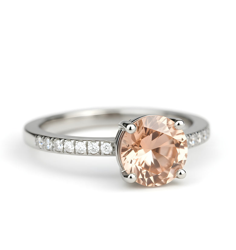 Dominantou prstenu je přírodní morganit o průměru 8 mm, který okouzlí svými jemnými růžovými až broskvovými tóny. Tento drahokam je symbolem lásky, něhy a harmonie a dodává prstenu elegantní, romantický vzhled.
