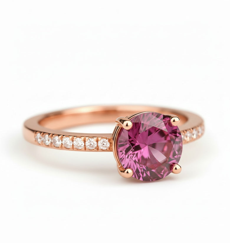 Alternativně nabízíme také variantu s růžovým turmalinem – rubelitem, vzácným drahokamem s intenzivní barvou v odstínech od sytě růžové až po hlubokou červenou. Rubelit dodává prstenu výraznější a smyslnější charakter a je ideální volbou pro ženy, které preferují výrazné barvy.